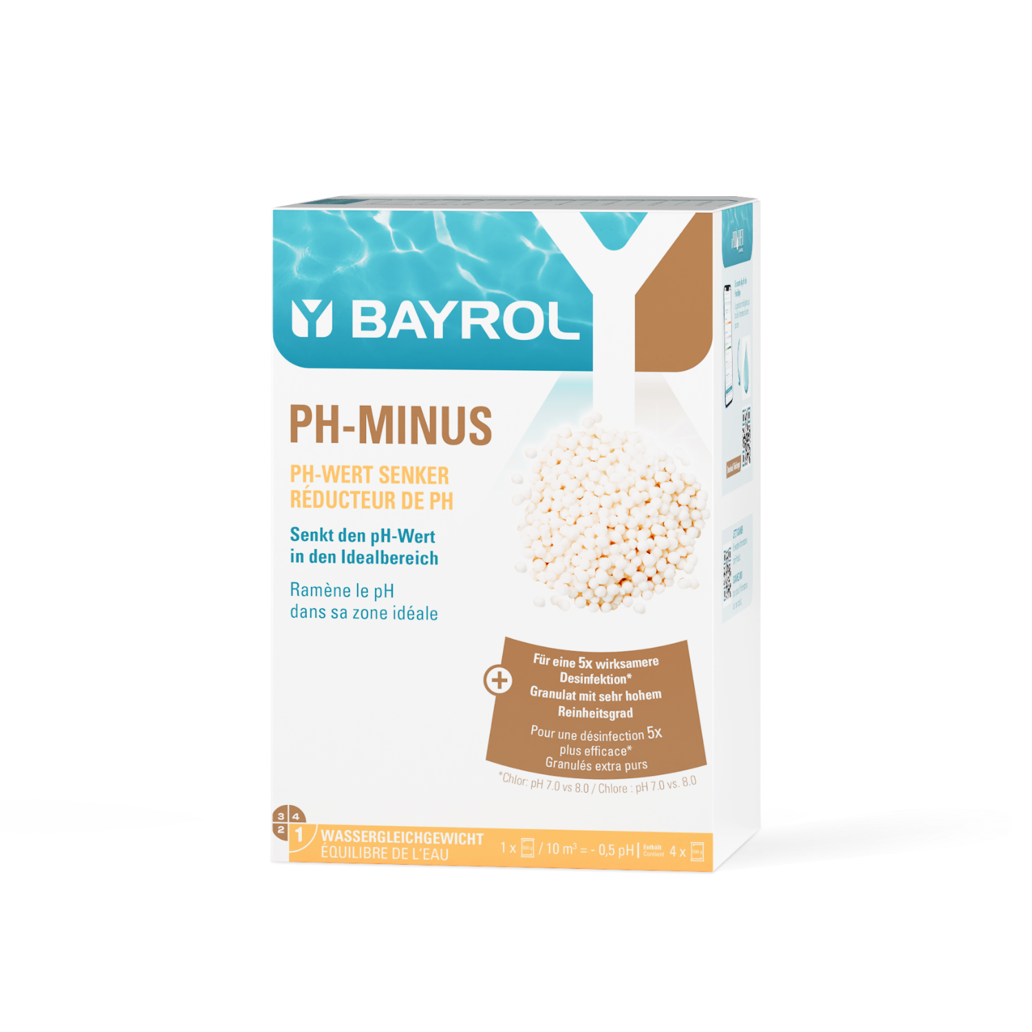 Zur Einhaltung des günstigsten ph-Wertes vom 7,0 – 7,4 sollten die Wasser-Werte 1-2 mal die Woche gemessen und ggf. korrigiert werden. ph-Werte über 7,6 sind durch Zugabe von ph-Minus zu senken. Um den ph-Wert um 0,1 zu senken, sind 100 g pro 10 m³ Schwimmbadwasser erforderlich.