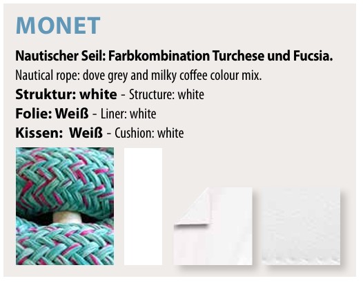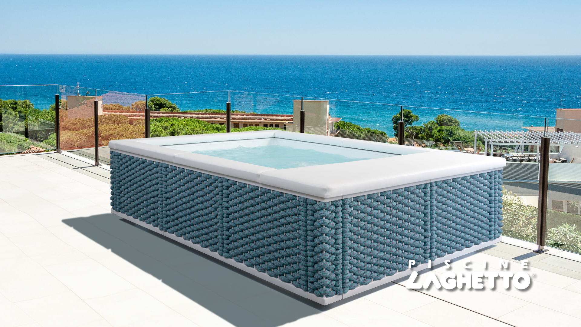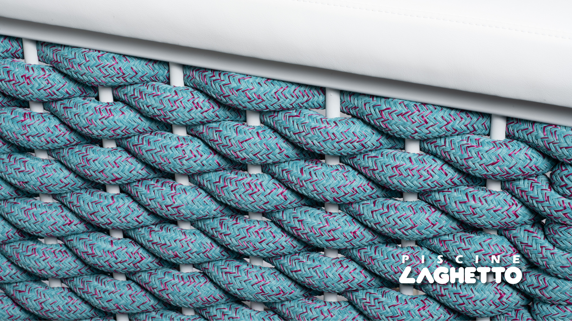 Beim neuen Ninfea-Minipool besteht die Verkleidung aus einem eleganten Geflecht aus nautischen Seilen, deren Farben in einem Spiel zarter Farbtöne an die Wirkung der Pinselstriche der Impressionisten erinnern sollen.