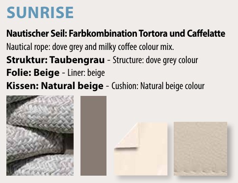 Das Auflagekissen von Ninfea besteht innen aus geschlossenzelligem Schaumstoff und einem wasserabweisenden Bezug Sky Natuico, der mit nicht aggressiven neutralen Reinigungsmitteln leicht desinfiziert werden kann.